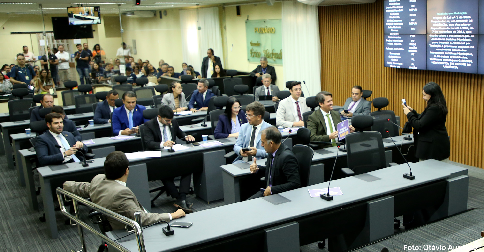 Entre os projetos aprovados está o PL nº 01/2026, que reestrutura a Assessoria Jurídica Municipal, institui o Adicional por Titulação e promove reajuste no vencimento básico dos Assessores Jurídicos.