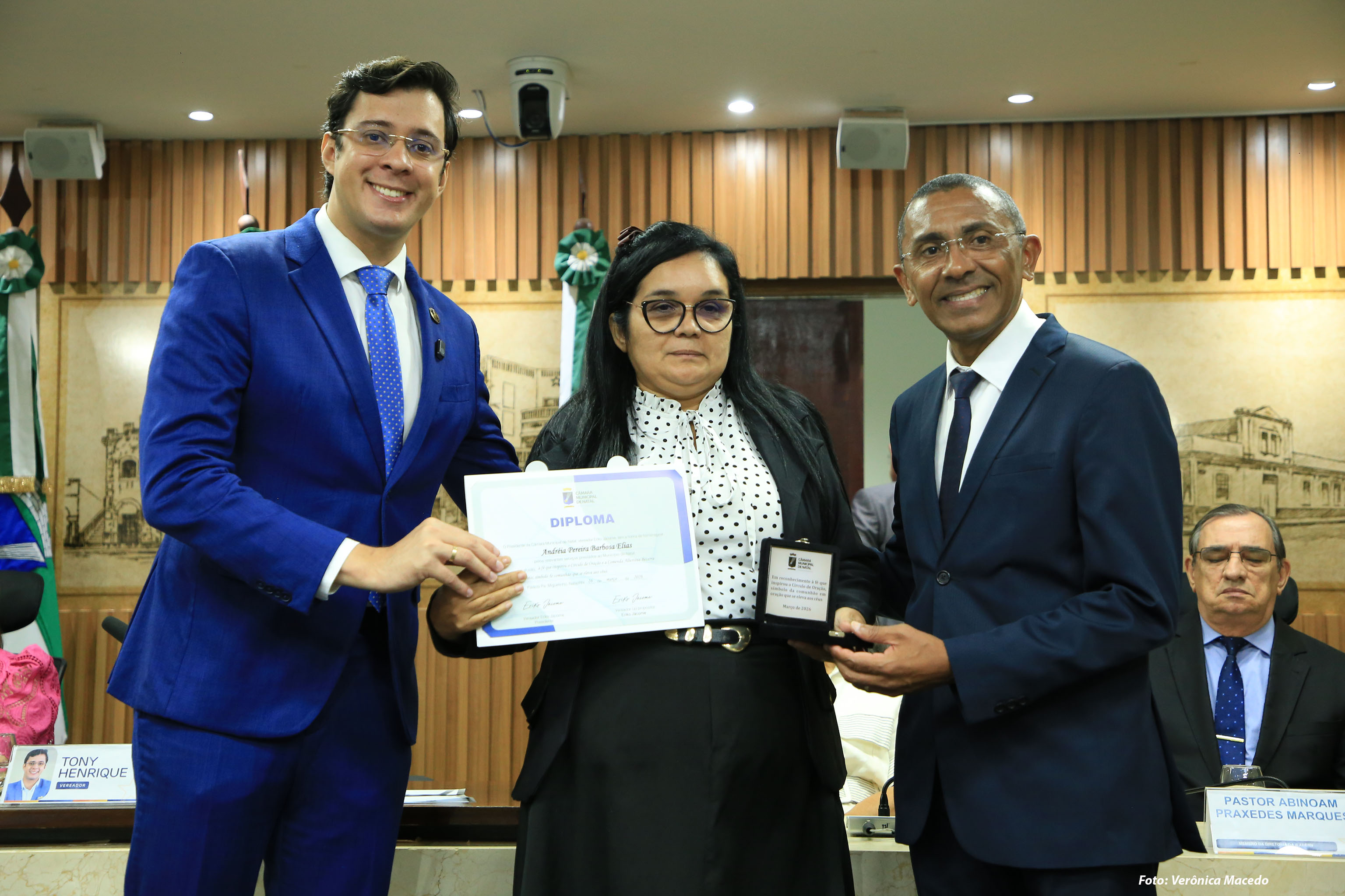 A Câmara Municipal de Natal realizou, nesta quinta-feira (26), sessão solene em homenagem ao Dia da Dirigente da Comissão de Visita e do Círculo de Oração. De proposição do vereador Tony Henrique, a solenidade homenageou 27 mulheres pela atuação espiritual, social e comunitária, além de conceder o título de cidadã natalense à religiosa Irenita Conde da Silva Bulhões.